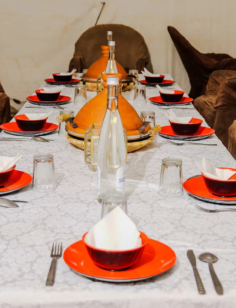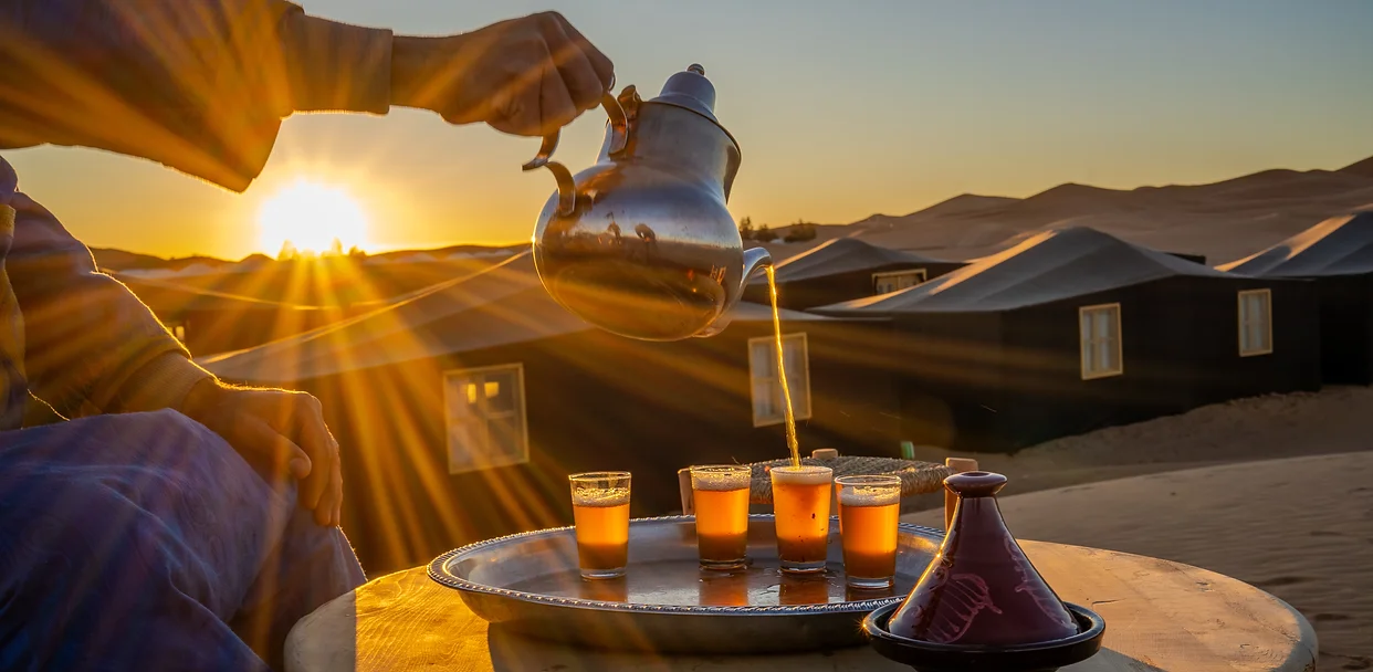 You will be welcomed with a glass of mint tea and served a typical Moroccan dinner under the starry sky.