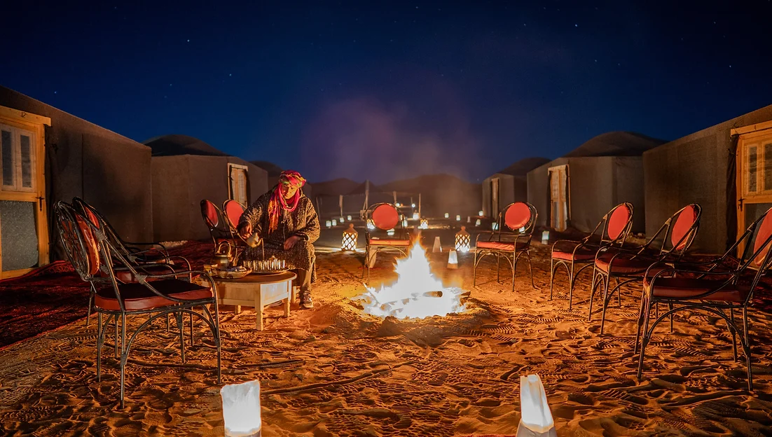Situated in Merzouga, Morocco, our camp boasts an ideal location amidst the picturesque dunes of the Sahara Desert. Guests can marvel at stunning sunrise and sunset views, embark on camel treks directly from the camp, and enjoy unparalleled access to the natural wonders of the desert landscape, making it a perfect base for desert adventures.